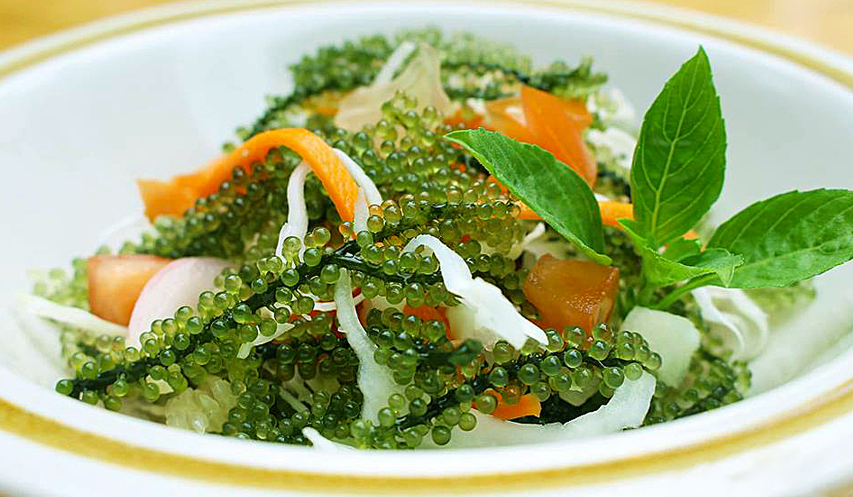 Remember to not immediately mix Sea grapes in salad because if left in vinegar juice, grape seaweed will shrink after about 5 minutes. Only when you begin to eat, you first coat grape algae on a plate of salad and then eat with the mixture on.